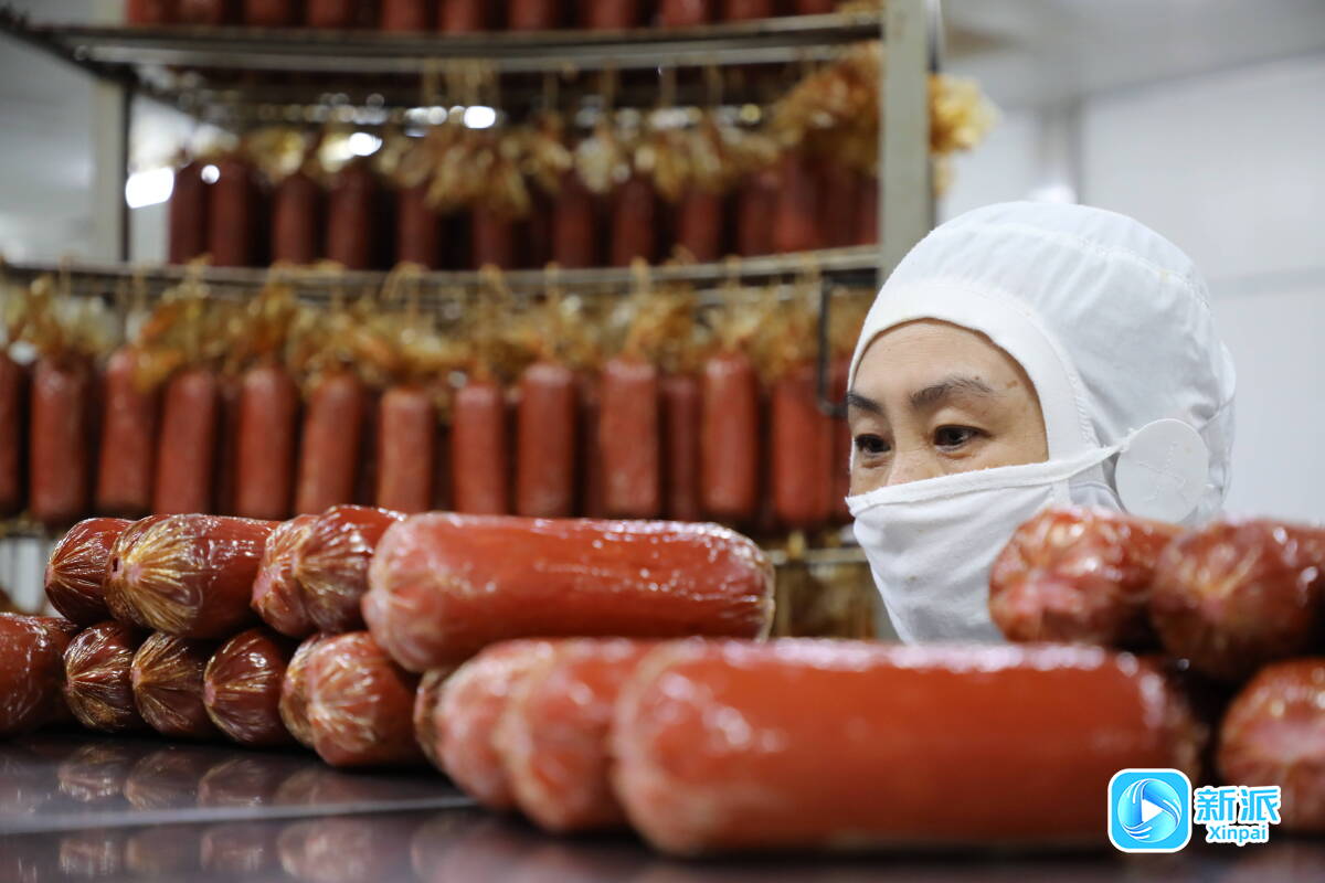 濰坊佳樂家農(nóng)產(chǎn)品加工配送中心有限公司肉食加工車間內(nèi),工人在加工火腿。